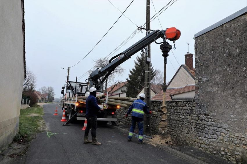 Les travaux pour la connection internet par la fibre avance. Sur les poteaux existants un calcul de charge est réalisé systématiquement. Si le poteau existant permet la pose d’un câble supplémentaire, pas de souci. La câble est posé sur celui-ci. Si tel n’est pas le cas, un poteau supplémentaire est installé.