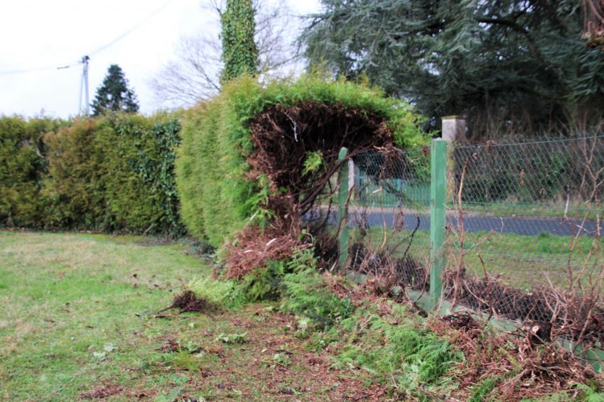 La haie de thuyas malade a été arrachée. Poteaux et bordure vont être réparées. Une nouvelle haie sera plantée dès que les conditions climatiques le permettront.