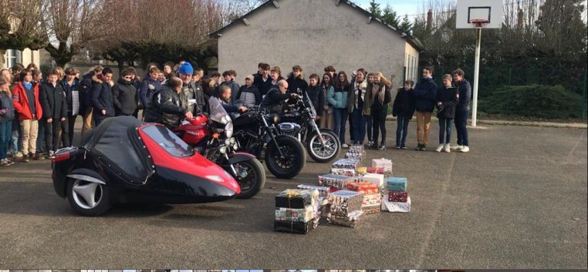 Le 15 décembre dernier, les élèves de 3ème ont remis une quarantaine de cadeaux, composés d’un objet chaud, un produit d’hygiène, un livre, une gourmandise et une carte de vœux, aux United Riders. Cette ONG a vu le jour en 2016 et a ouvert une antenne à Blois. Régulièrement, une maraude fixe est organisée devant l’église Saint-Vincent pour proposer des vêtements aux personnes sans domicile fixe (SDF) de Blois. Pour Noël, les United Riders collectent ces cadeaux pour offrir une parenthèse de surprises! Ils sont donc venus en motos et side-cars ce jeudi 15 décembre, nous les yeux ébahis des élèves fiers de leurs dons!
